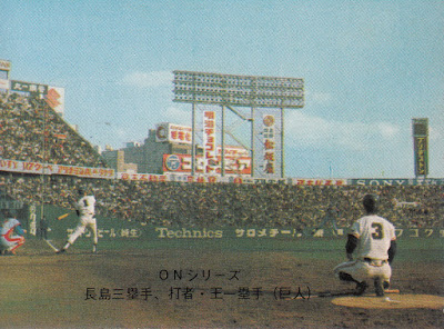 This last card is one that I've been coveting every since Sean first wrote about it. It shows Shigeo Nagashima kennling on deck while Sadaharu Oh bats at Korakuen Stadium. It'd be a great card anyway but what makes it even better is that it's from Nagashima's retirement game in 1974. Because Mandarake said it was in "below average condition" it was just 400 yen:
