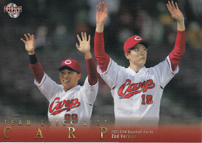 The theme for the team checklists is "early season highlights" for lack of a better term. There's a couple photos of post game celebrations, either on the field or during the "Hero Interviews". There's also an action shot of Shogo Nakamura of the Marines sliding head first into home and the Dragons' mascot Doala doing his backflip. Here's the Carp card showing Ryutaro Hatsuki (#69) and Masato Morishita (#18):